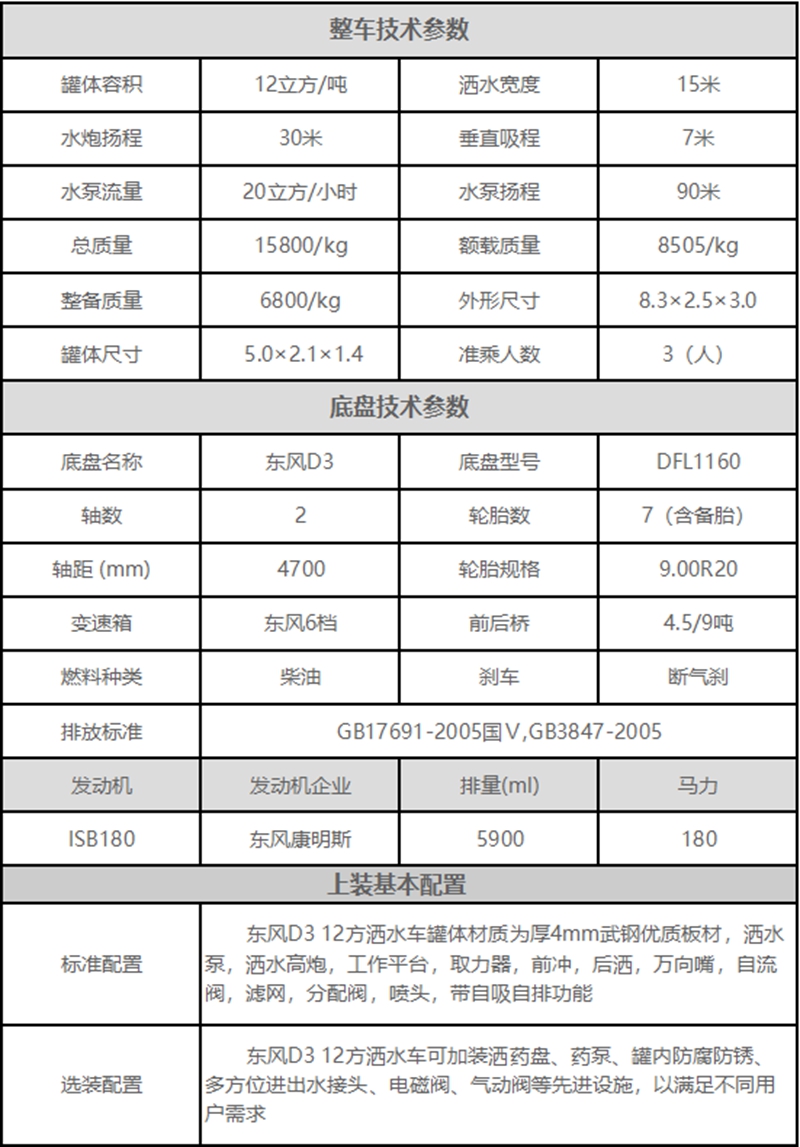 國(guó)六東風(fēng)D3系列12-15方灑水車(chē),底盤(pán)型號(hào):DFV1163GP6DJ, 陜齒小八檔(8JS85E),發(fā)動(dòng)機(jī)采用康機(jī)D4.0NS6B195 (4缸發(fā)動(dòng)機(jī)),國(guó)六排放,前橋2.8T,后橋8T,9.00鋼絲胎(9.00R20)ABS,原廠空調(diào)、氣 囊座椅、多功能方向盤(pán)、MP5、行車(chē)記錄儀、中控門(mén)鎖帶遙控鑰匙。上裝:罐體采用標(biāo)準(zhǔn)Q235 碳鋼制作,罐體自動(dòng)焊,配大功率專(zhuān)用灑水車(chē),可自吸自排,前沖后灑,側(cè)噴,高位花灑,主 管道加粗,大通徑球閥,直通球閥式消防接口,帶后工作平臺(tái),沖孔平臺(tái),帶高炮。