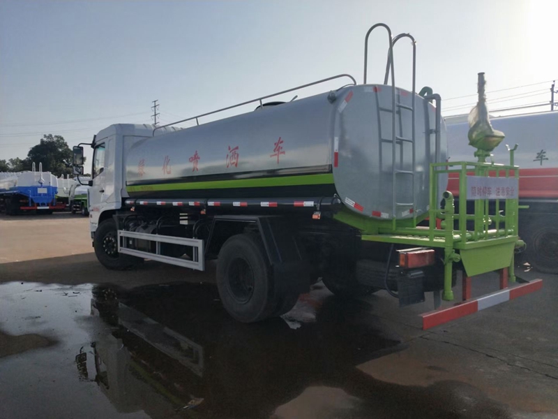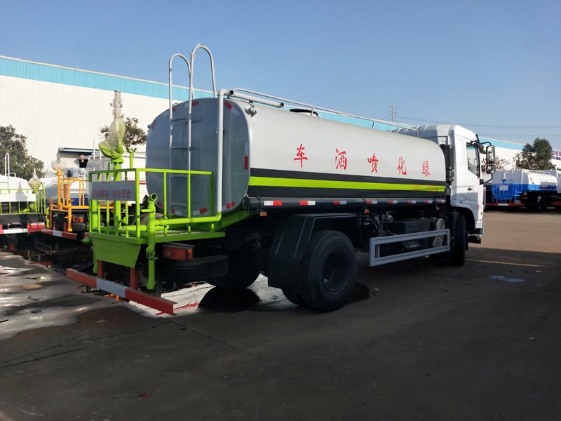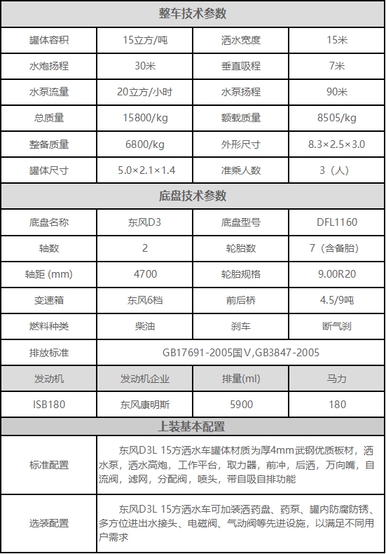 上裝:容積15立方,罐體采用標準Q235碳鋼制作,板材厚度4mm,配大功率專用灑水車,可自吸自排,前沖后灑,側噴,高位花灑,主管道加粗,直通球閥式消防接口,帶后工作平臺,沖孔平臺,帶高炮。