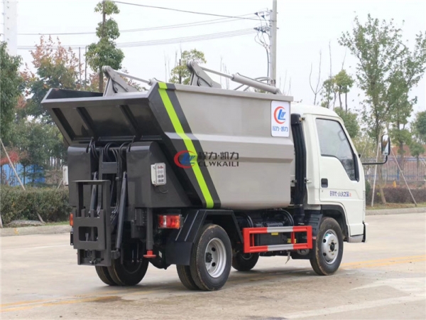 3.1到達垃圾站,伸出支腿,傾翻垃圾箱,打開滑板及刮板,傾倒垃圾。