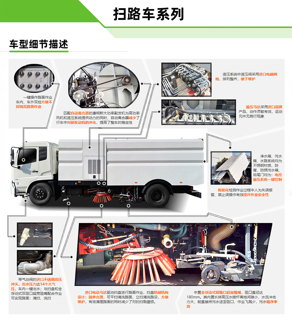 帶掃盤4把,江鈴副發動機;大力馬達;施耐德控件開關;臺灣電磁閥組;免維護自分離式離合器;免維護風機;不銹鋼水箱;不銹鋼垃圾箱;尾部LED箭頭燈;手動泵應急系統;刷臂轉動機構使用高新耐磨工程隔套,免打黃油;精密冷彎無縫液壓油管。