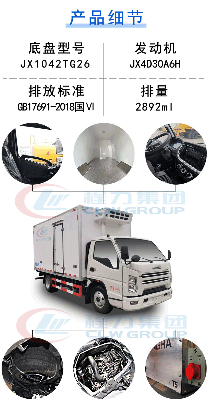 | 其他 | 車廂頂部封閉,不可開啟,導流罩為選裝件,選裝無側開門結構,選裝廂體側面開門樣式,選裝制冷量相同的制冷機組。ABS系統(tǒng)型號:APG3550500A,ABS系統(tǒng)生產(chǎn)廠家:浙江亞太機電股份有限公司;ABS系統(tǒng)型號: VIE ABS-II,ABS系統(tǒng)生產(chǎn)廠家: 浙江萬安科技股份有限公司。側防護采用冷彎型鋼/Q235-B,螺栓連接,后防護采用冷彎型鋼/Q235-B,焊接連接,后防護截面高度尺寸100mm,截面寬度尺寸50mm,下邊緣離地高度420mm。發(fā)動機型號/油耗申報值對應關系為:JX4D30A6H/11.4L/100km,JX4D30C6H/11.4L/100km,JX4D30B6H/11.4L/100km。 | ||