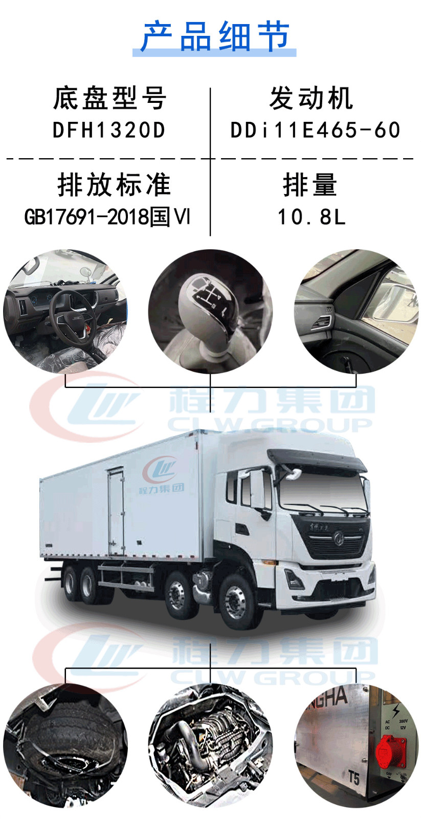 其他 隨底盤選裝僅高度不同的駕駛室,高頂駕駛室頂部氣喇叭為選裝件,駕駛室前角擾流板為選裝件,選裝單油箱或雙油箱;貨廂選裝單開門,雙開門和不開門型式;選裝其它廠家功率相當的制冷機組,選裝前置式,內置式,底置式制冷機組;選裝升降尾板,尾板收起狀態時的水平長度為295mm;廂體頂部封閉,不可開啟;側防護:材料Q235,螺栓連接;后下防護:材質Q235.螺栓連接,斷面尺寸120×60mm,離地高度460mm;安裝具有衛星定位功能的行駛記錄儀;裝有ABS,ABS型號/生產廠家:ABS 8/東科克諾爾商用車制動系統(十堰)有限公司;發動機DDi11E465-60對應油耗申報值37.1L/100km.