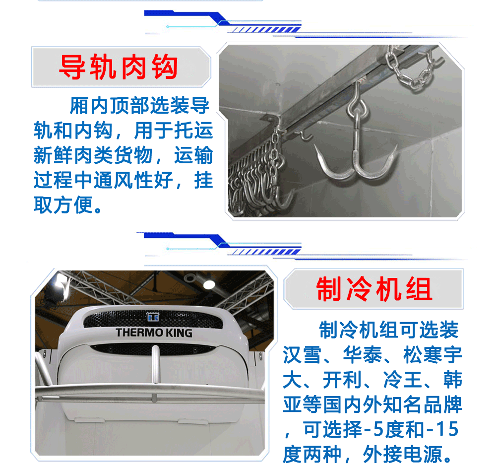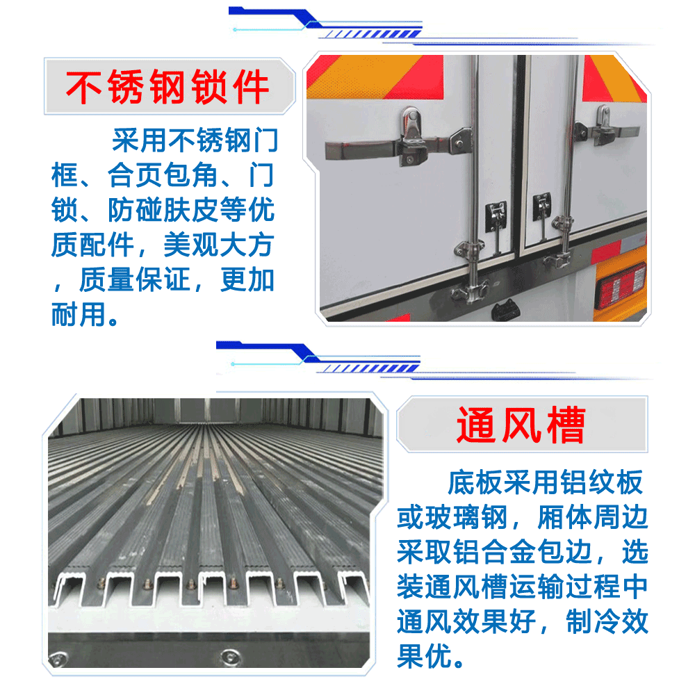 國六東風多利卡冷藏車整車尺寸:5995*2040*3000箱體尺寸:4100*1840*1820功率/馬力:95KW 130馬力3.7L排量東風朝柴發動機(CY4BK461)7.00R16輪胎軸距:3308加裝零下15度制冷機空調、動轉、斷氣剎、ABS、中控鎖+電動車窗+遙控、剎車自調臂、可調大燈、日間行車燈,多功能方向盤上裝配置:箱體為內外玻璃鋼板,中間保溫材料為8cm聚氨酯保溫板,鋁花紋底板,箱體鋁合金型材包邊,包角,配雙開后門,單開側門,不銹鋼門框、鎖件、鉸鏈,其余